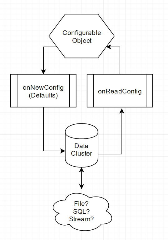 As you can see, the data cluster plays a big part and actually holding the data, while the configurable object uses it and is controlled by a loader or saving instance.